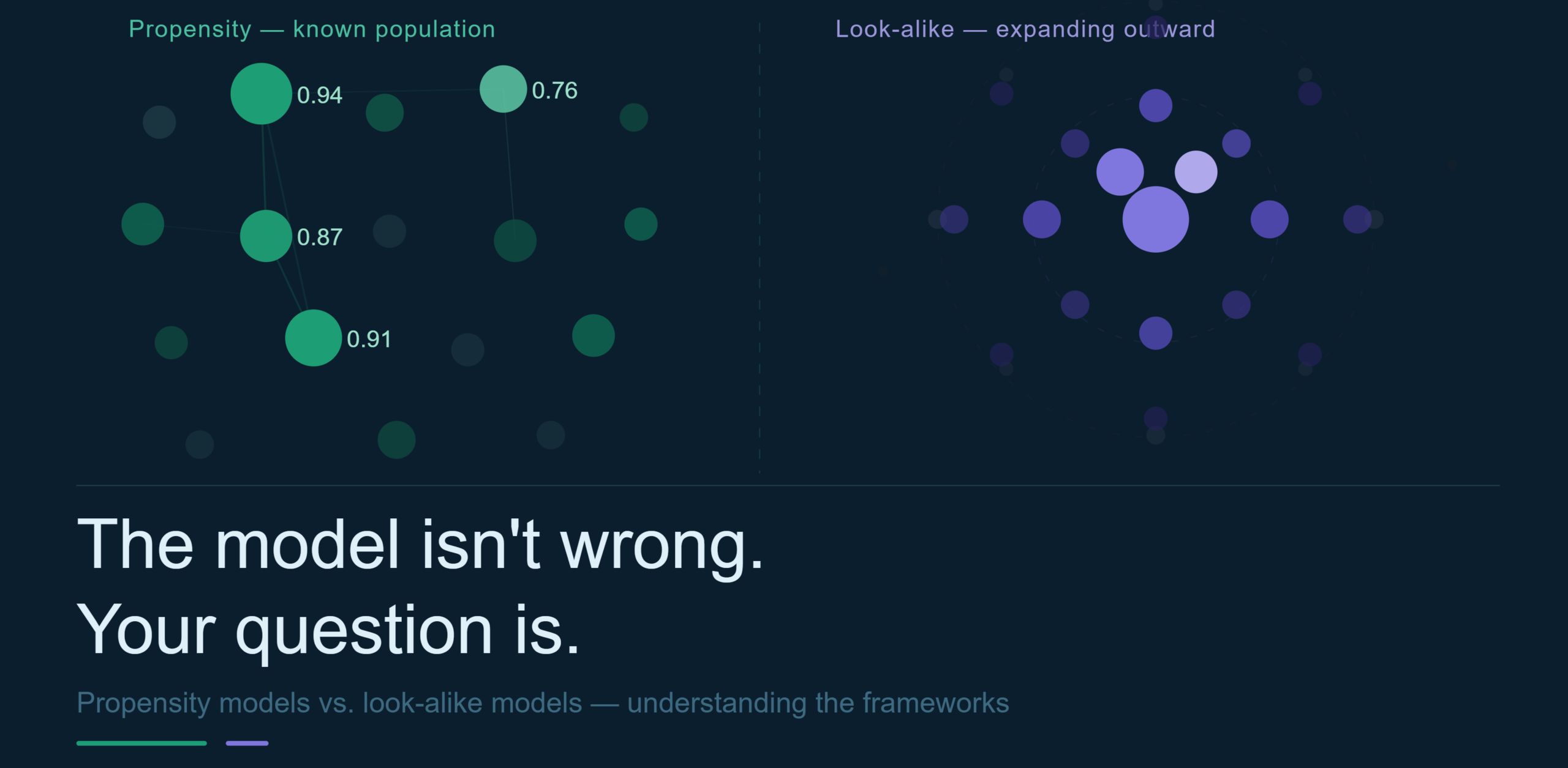Look-alike models are about inference from resemblance. They know less about each individual but operate across a vast external population, using structural similarity as a proxy for behavioral alignment. The intelligence is wide and probabilistic.
